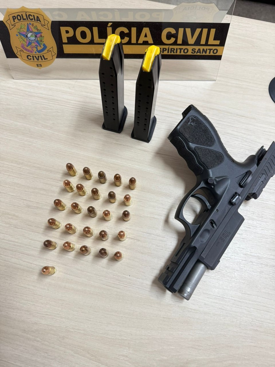 As diligências foram realizadas na residência de um suspeito de 52 anos, que não se encontrava no imóvel no momento da ação. Durante as buscas, os policiais civis localizaram e apreenderam uma arma de fogo da marca Taurus, calibre 9mm, com dois carregadores e 26 munições intactas.