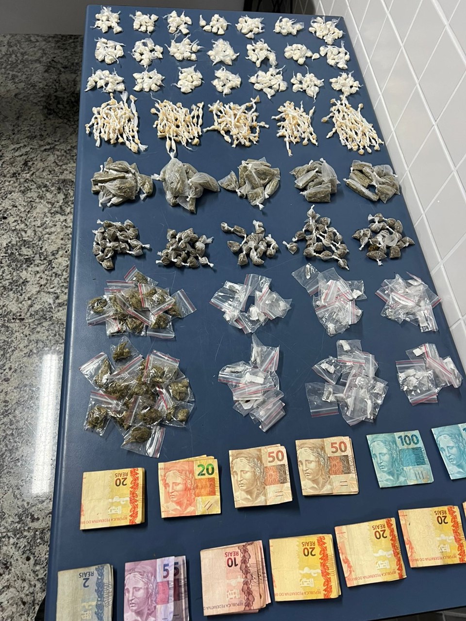 Ao perceberem a aproximação policial, os suspeitos tentaram fugir e arremessaram o material entorpecente em uma área de vegetação, porém todos foram alcançados e detidos. Com o grupo, foram apreendidos 229 pinos de cocaína, 171 porções de maconha, 65 buchas de haxixe, 483 pedras de crack, além de R$ 1.116,00 em espécie.