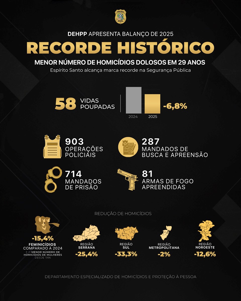 A Polícia Civil do Espírito Santo (PCES), por meio do Departamento Especializado de Homicídios e Proteção à Pessoa (DEHPP), apresentou o balanço das ações desenvolvidas ao longo do ano de 2025, destacando um marco histórico na segurança pública capixaba: o menor número de homicídios registrados nos últimos 29 anos no Estado.