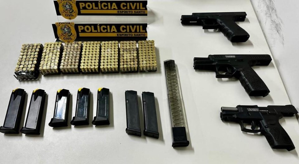 No local, os policiais localizaram e apreenderam três pistolas de uso restrito, todas de calibre 9mm, além de diversas munições e carregadores de munição, sendo um deles do tipo alongado.