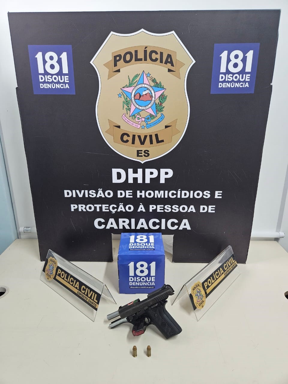 O indivíduo é apontado como um dos principais alvos da unidade e faccionado ao Primeiro Comando de Vitória (PCV). Na residência do suspeito, foram apreendidos uma arma de fogo, um carregador de pistola e munições.