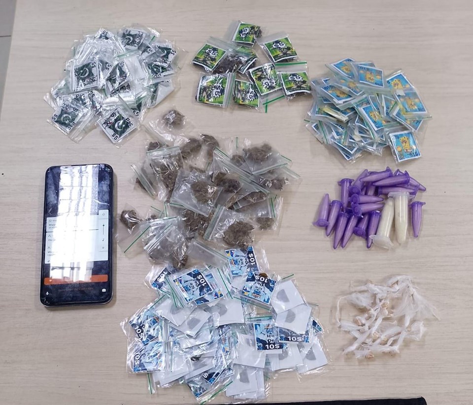 Ao todo, foram apreendidos 20 pinos de cocaína, nove buchas de maconha, 24 pedras de crack, 31 buchas de skunk, 59 papelotes de ice, 50 papelotes de pac e 39 papelotes de crab.