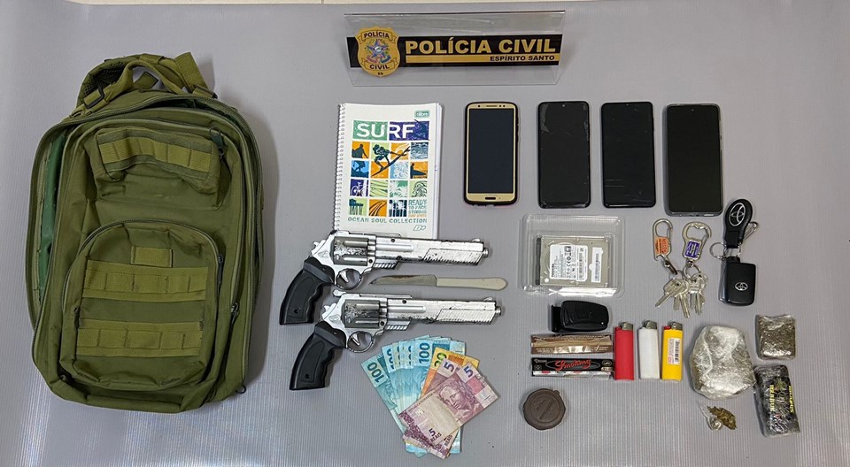 Poucos metros depois ele foi alcançado, se rendeu, foi preso. Na residência do detido foi localizado e apreendido três porções de maconha, dois simulacros de revólveres, R$ 1.030,00 em espécie, um HD e três celulares.