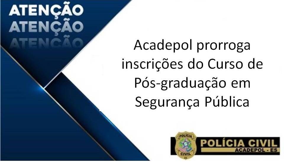 A Polícia Civil do Espírito Santo (PCES) informa que o edital do Processo Seletivo para o curso de pós-graduação Lato Sensu em Segurança Pública da Academia de Polícia Civil (Acadepol) foi alterado e as inscrições foram prorrogadas. Agora, o período de inscrições será de 13 a 24 de maio. A prorrogação foi oficializada por meio do edital 04/2024, publicado na edição do Diário Oficial do Estado, desta segunda-feira (20).