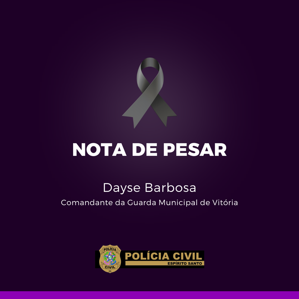 É com profundo pesar que a Polícia Civil do Espírito Santo (PCES) recebeu a notícia da morte da Comandante da Guarda Municipal de Vitória, Dayse Barbosa, ocorrido na madrugada desta segunda-feira.