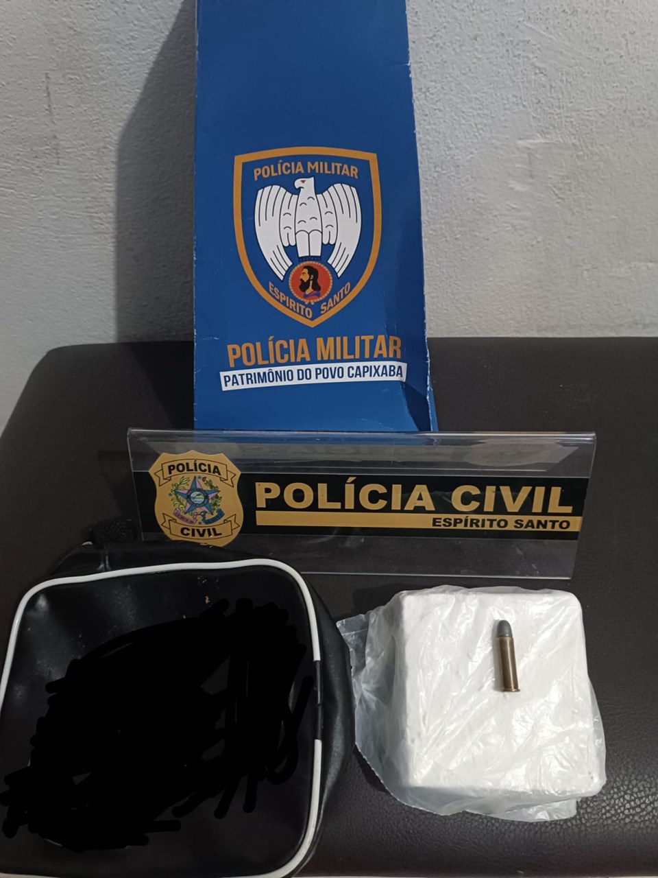 No primeiro alvo, foi dado cumprimento a um mandado de busca na residência de um investigado, de 27 anos. Durante as buscas, foram encontradas 500 gramas de pasta base de cocaína e 01 munição calibre 38. Os ilícitos estavam escondidos no guarda-roupa do casal, dentro de uma bolsa preta.