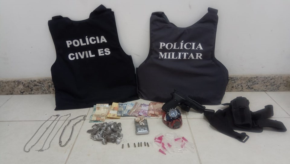 Duas equipes da PMES, juntamente com 13 policiais civis, iniciaram as buscas nas primeiras horas da manhã de domingo. O primeiro alvo foi um homem de 20 anos, preso em sua residência, no Morro do Sabão, bairro Vila Alta, em Alegre. Na casa dele, os policiais encontraram um simulacro de pistola, munições, um coldre e material para embalo de entorpecentes.
