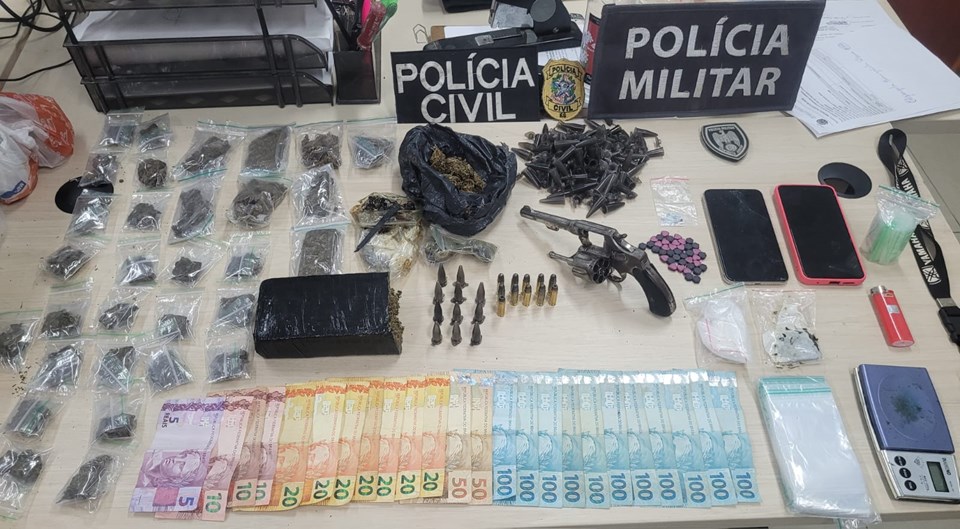 Durante a diligência, os policiais constataram movimentação típica da comercialização de entorpecentes no imóvel investigado. No local, foram apreendidos aproximadamente 650 gramas de maconha, 11 pinos de cocaína e mais 18 gramas de cocaína em porção avulsa, uma porção de haxixe, 40 comprimidos de droga sintética “bala”, 12 unidades de LSD, um revólver calibre .32 com 11 munições, uma balança de precisão, dois aparelhos celulares, R$ 1.375,00 em espécie e um carro.