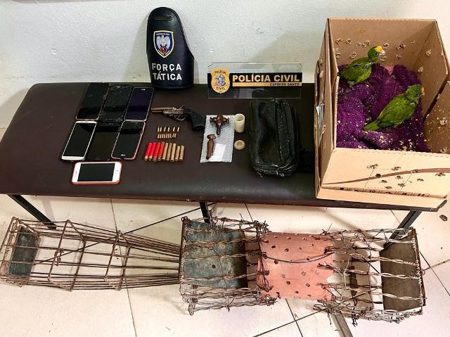 Na ação, foram apreendidos sete aparelhos celulares, uma arma de fogo, dois filhotes de papagaio, 15 munições de calibre .22, nove munições calibre .36, chumbos para recarga de munições, dois apitos de caça e duas armadilhas para captura de animais silvestres.