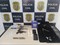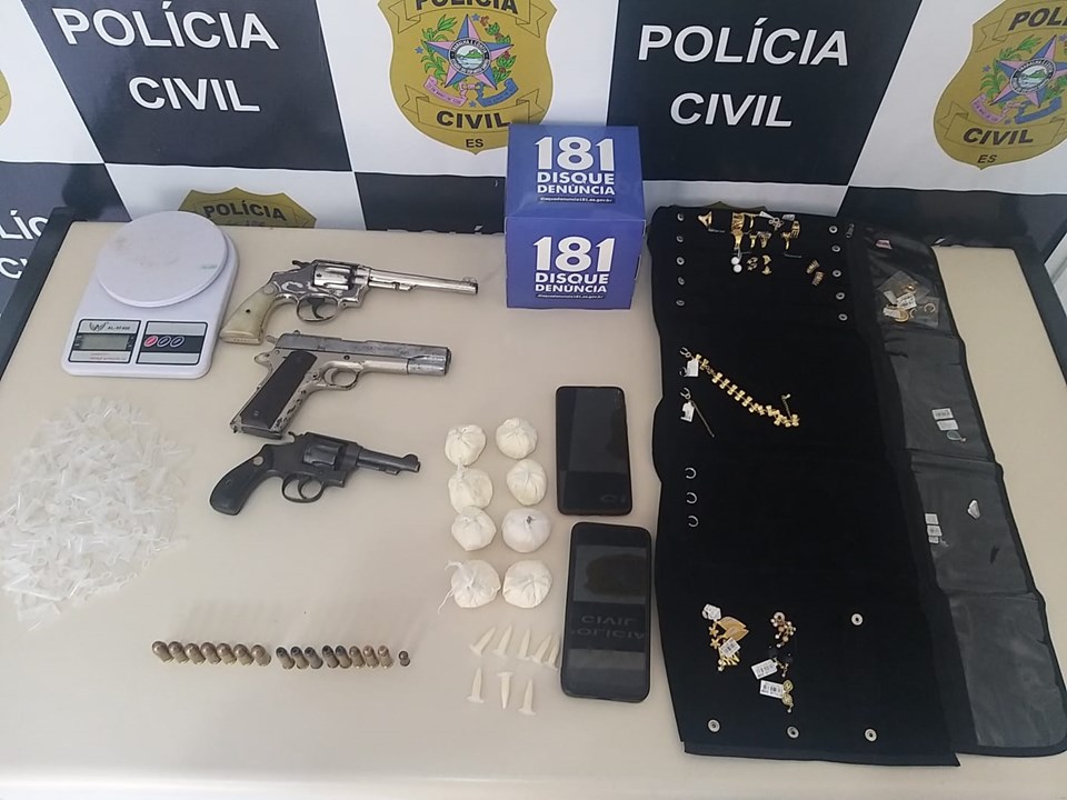 No local, a polícia apreendeu uma pistola Colt, calibre .45, um revólver, calibre 38, um revólver, calibre 32, oito munições calibre 38, sete munições calibre 45, uma munição calibre 32, além de uma balança de precisão, oito porções de cocaína, pesando aproximadamente 195 gramas, oito pinos de cocaína, 158 de pinos vazios utilizados para envase de cocaína e diversas peças de semijoias com etiquetas.