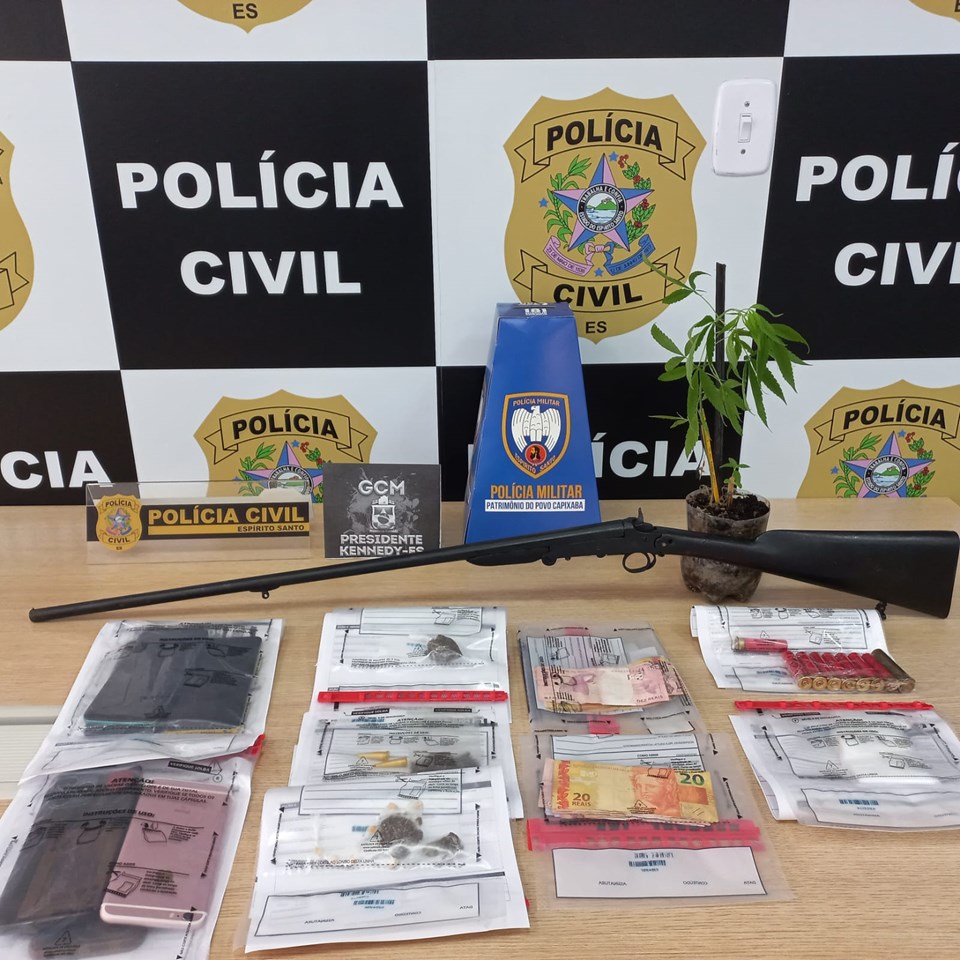 Uma operação conjunta entre a Polícia Civil do Espírito Santo (PCES), a Polícia Militar do Espírito Santo (PMES) e a Guarda Civil Municipal de Presidente Kennedy, realizada na manhã dessa quarta-feira (03), resultou na prisão de quatro pessoas e na apreensão de drogas, arma de fogo e munições, no município de Presidente Kennedy.