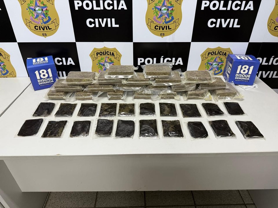 A partir dessas informações, a equipe do Denarc passou a monitorar o andamento da encomenda e realizou diligências para identificar o destinatário e o conteúdo do pacote. Ao ser recebida, a encomenda se tratava de uma caixa com embalagens de erva-mate e, no interior delas, foram localizadas 20 embalagens a vácuo de haxixe, totalizando cerca de dois quilos, e 20 tabletes de maconha, totalizando aproximadamente sete quilos.