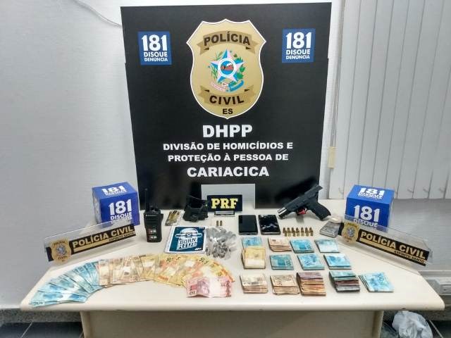 A Polícia Civil do Espírito Santo (PCES), por meio da Divisão Especializada de Homicídios e Proteção à Pessoa (DHPP) de Cariacica, com o apoio da Polícia Rodoviária Federal (PRF), prendeu, nesta segunda-feira (21), dois suspeitos de 22 e 31 anos, durante uma operação policial realizada no bairro Vila Independência, na localidade conhecida como “Morro dos Gama”, em Cariacica. Com os suspeitos, foram apreendidos, dinheiro, arma, munições, rádio comunicador e anotações do tráfico de drogas.