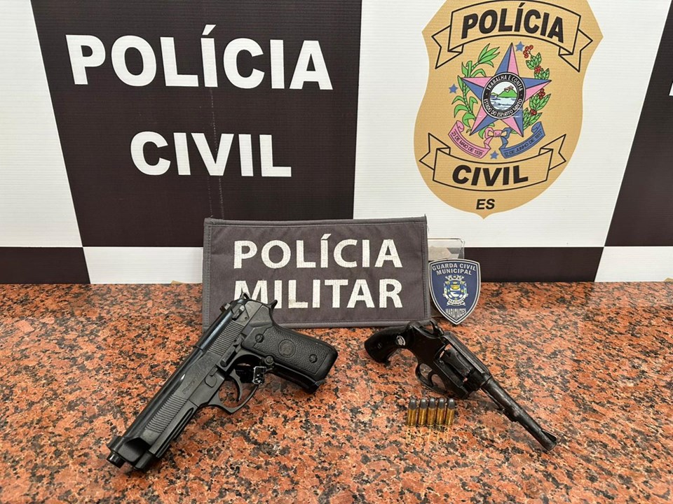 No imóvel, os policiais localizaram e apreenderam um preservativo masculino aberto, um revólver calibre .32 com numeração raspada e cinco munições intactas, um simulacro de pistola e um telefone celular. O suspeito não tinha registro da arma de fogo.