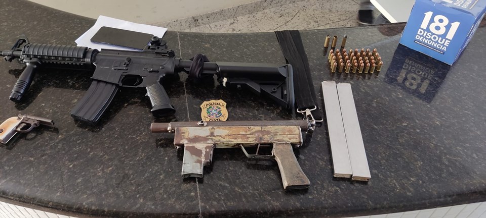 Junto com o suspeito, foi apreendida também uma adolescente de 13 anos de idade, com os dois foram apreendidas duas armas de fogo, uma submetralhadora de fabricação caseira, com carregadores, e uma garrucha calibre 22, 42 munições de diversos calibres e um simulacro airsoft de fuzil.