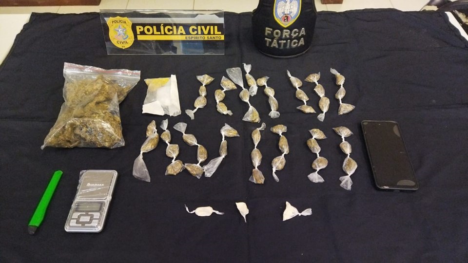 A ação resultou na apreensão de aproximadamente 170 gramas de maconha, 12 gramas de crack, porções de cocaína e uma balança de precisão. As diligências contaram com o apoio da equipe da Força Tática da 2ª Companhia Independente da Polícia Militar do Espírito Santo (PMES).