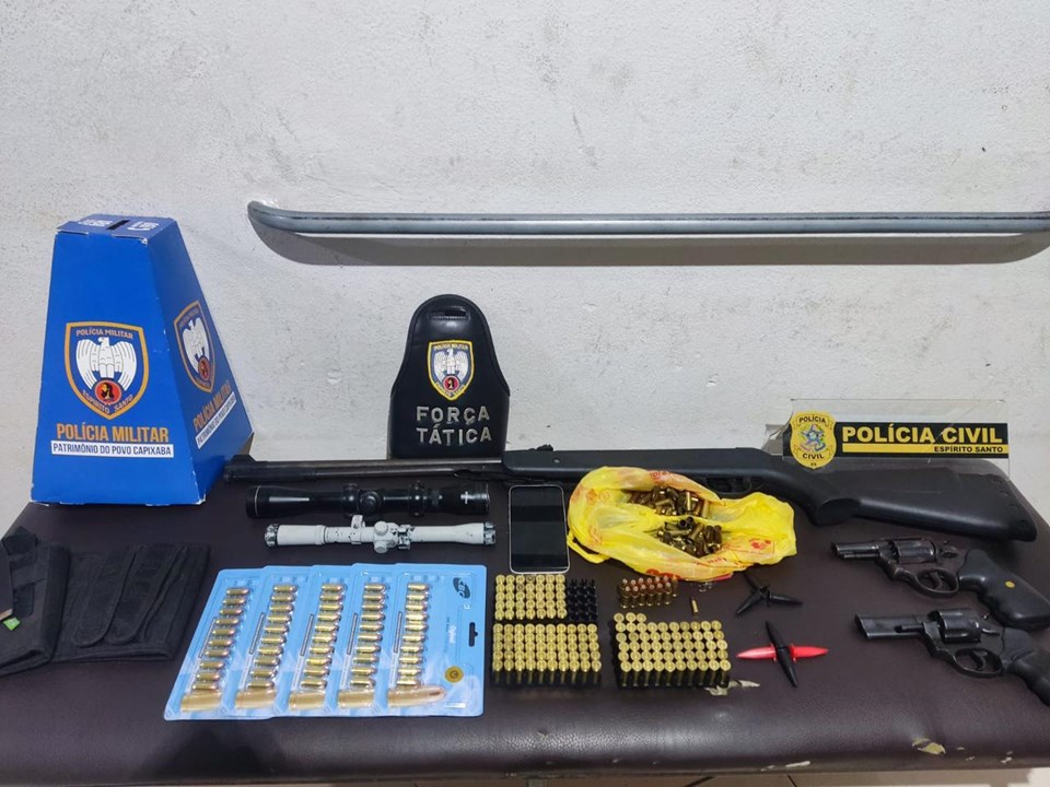 Durante as buscas, foram apreendidos dois revólveres, uma carabina de pressão, 202 munições de diferentes calibres, 48 cápsulas deflagradas, 55 pinos de cocaína, duas lunetas, material para embalo de entorpecentes e um aparelho celular.