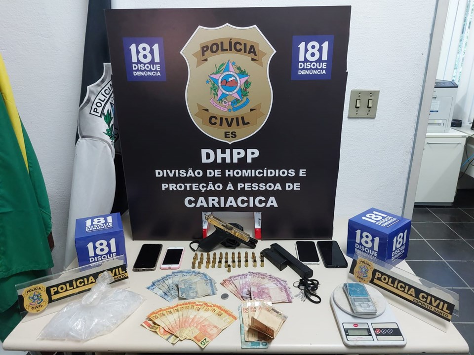A Polícia Civil do Espírito Santo (PCES), por meio da Divisão Especializada de Homicídios e Proteção à Pessoa (DHPP) de Cariacica, prendeu, nesta quinta-feira (06), dois suspeitos, de 23 e 28 anos, durante operação realizada na localidade conhecida como “Morro do Quiabo", no bairro Porto Novo, em Cariacica. Na ação, foram apreendidos celulares, dinheiro, arma, munições, balanças de precisão e uma moto com restrição de roubo.