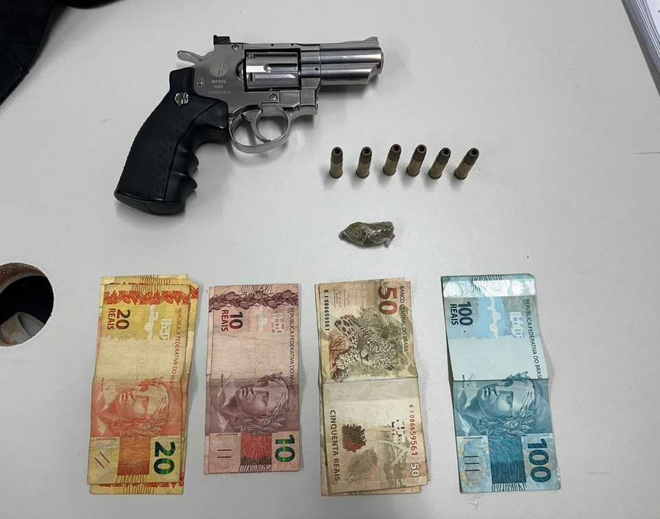 Durante a abordagem, foram encontradas uma bucha de maconha e a quantia de R$ 450,00 em espécie, além de um simulacro de arma de fogo semelhante ao utilizado no crime.
