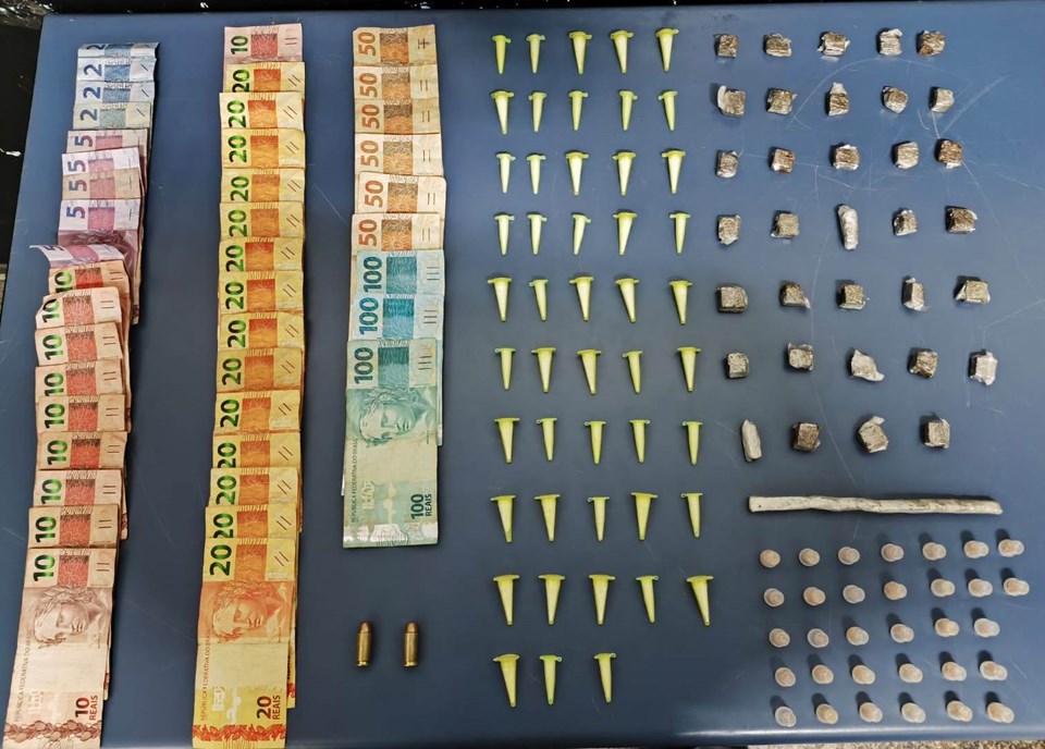 Dando continuidade à diligência, a equipe se deslocou até o imóvel, onde, com a autorização do avô do detido, foram realizadas buscas no quintal e no interior da casa. No local, foram encontradas 34 buchas de substância análoga à maconha, 32 pinos de substância análoga à cocaína, duas munições calibre. 40, além de R$ 1.023,00 em dinheiro trocado, possivelmente oriundo da comercialização de drogas.