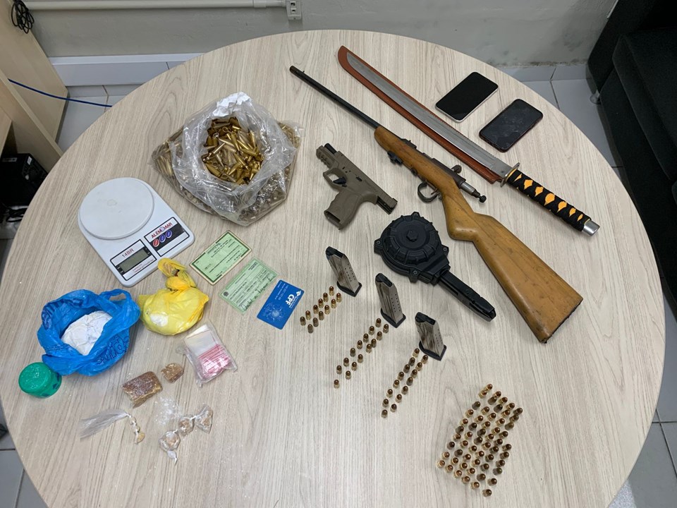 No imóvel onde o suspeito se encontrava escondido, as equipes policiais localizaram e apreenderam uma pistola calibre 9mm, de fabricação turca, além de munições de diversos calibres, carregadores sobressalentes e um carregador de alta capacidade do tipo “carrossel”.
