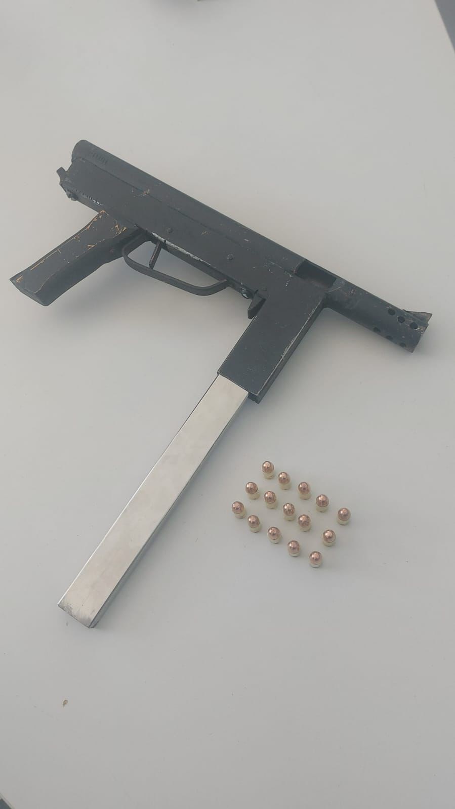 Durante as buscas no imóvel, foi localizada, sobre um sofá e coberta por uma capa de colete balístico, uma submetralhadora automática de fabricação caseira, além de 15 munições calibre .380 intactas.