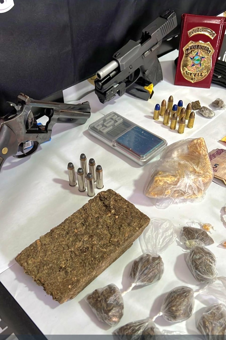 Durante as diligências realizadas no Centro de Montanha, os policiais localizaram o suspeito de 25 anos, alvo de mandado de prisão temporária. Durante o cumprimento da ordem judicial, os militares da Força Tática visualizaram o momento em que o indivíduo dispensou uma arma de fogo pela janela. Após a entrada no imóvel, foram apreendidas três buchas de maconha e, no quintal vizinho, um revólver calibre .357 municiado com seis munições. O suspeito foi autuado em flagrante por tráfico de drogas e posse de arma de fogo de uso restrito.