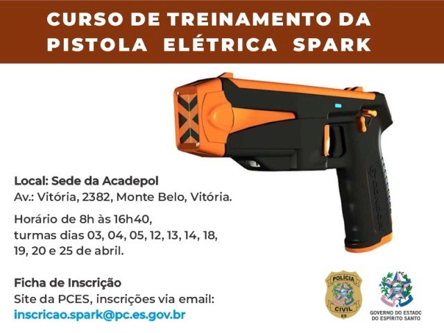 Dando início ao ciclo de treinamentos, entre os dias 03 e 25 de abril acontecerá o Curso de Capacitação de Dispositivo elétrico incapacitante, modelo SPARK. As aulas serão realizadas na Sede da Acadepol, localizada na Avenida Vitória, bairro Monte Belo, em Vitória.