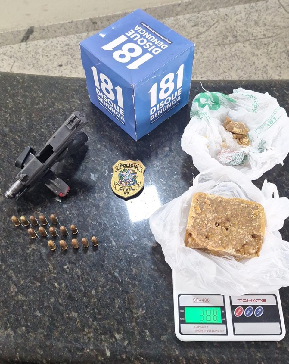 As primeiras diligências do dia foram realizadas no bairro Movelar, em Linhares. No local, os policiais civis realizaram o cerco a uma residência e cumpriram mandado de busca e apreensão. Nas buscas, foram encontradas quase 500 gramas de crack, além de uma balança de precisão, sacolas de plástico para acondicionar e traficar drogas, uma pistola e munições calibre 9 mm.