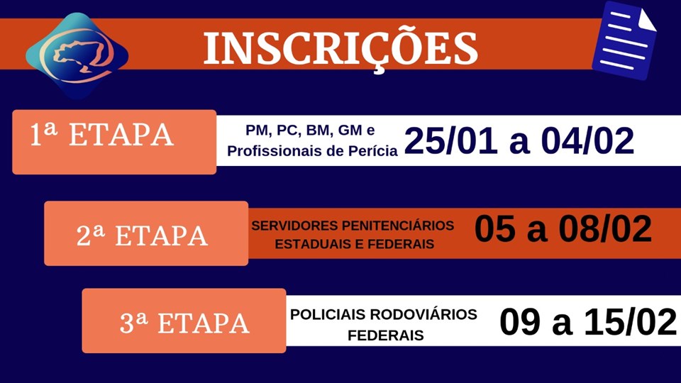 As inscrições para a 1ª etapa, composta pelos integrantes da PC, PM, BM e GM, iniciam no dia 25 de janeiro e terminam no dia 04 de fevereiro. Já para os agentes penitenciários, que fazem parte da 2ª etapa, as inscrições poderão ser realizadas do dia cinco de fevereiro ao dia oito do mesmo mês. Na 3ª etapa, os profissionais da PRF terão do dia nove ao dia 15 de fevereiro para efetuar as inscrições.