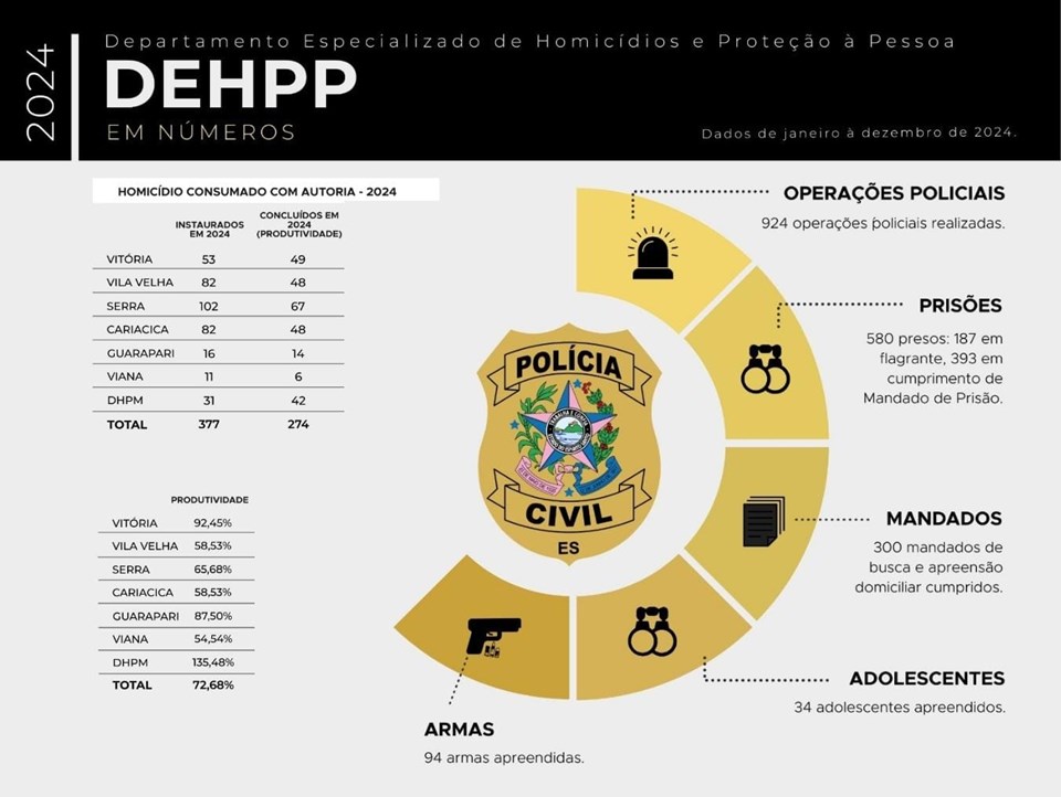 Todos estes dados fazem parte do balanço do Departamento de Homicídios, que reúne os resultados das Divisões de Homicídios e Proteção à Pessoa de Vitória, Vila Velha, Serra, Cariacica, Guarapari, Viana e da Divisão de Homicídios e Proteção à Mulher (DHPM).