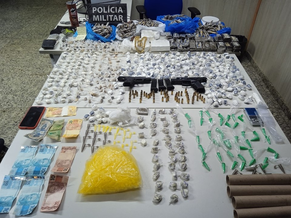 No local, o suspeito conseguiu fugir, deixando os ilícitos para trás. Foram apreendidos cerca de 10 quilos de drogas, incluindo 594 unidades de maconha, 341 papelotes de cocaína, 126 papelotes de crack, 04 tabletes de pasta base de cocaína e 14 pedaços de haxixe, além de uma pistola calibre 9mm, um simulacro de arma de fogo, dinheiro e anotações de contabilidade do tráfico.
