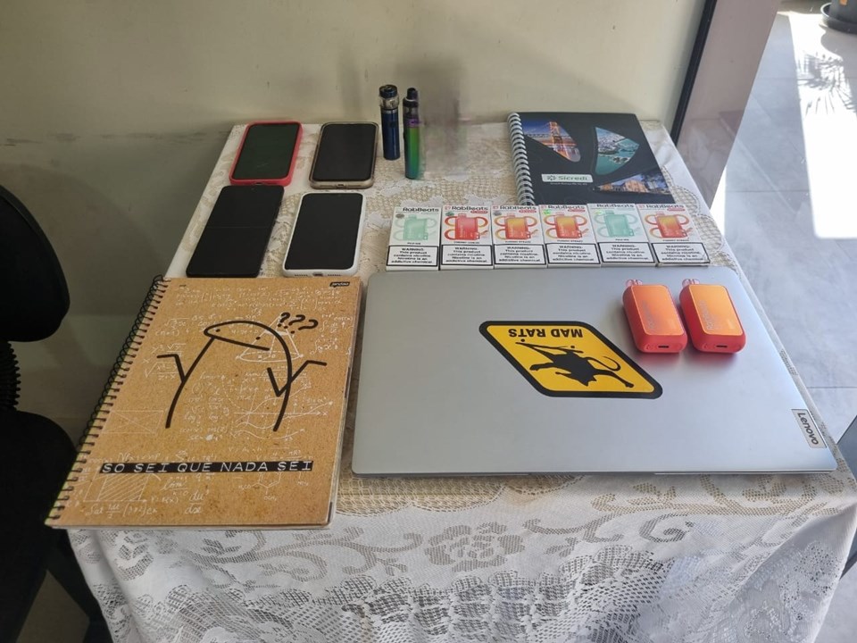 Durante a diligência, foram apreendidas seis caixas fechadas de cigarros eletrônicos, além de frascos usados. Também foram recolhidos celulares, um notebook utilizado no gerenciamento da loja e dois cadernos com anotações de controle de vendas.
