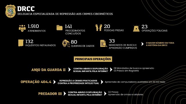 Em 2022, a equipe da Delegacia Especializada de Repressão aos Crimes Cibernéticos (DRCC) cumpriu 33 mandados de busca e apreensão durante investigações de crimes informáticos. Este é o maior número de mandados de busca cumpridos em toda a história da DRCC, fruto da especialização da equipe, que tem focado na parceria com instituições internacionais para adquirir conhecimento e aprimorar suas ferramentas de investigação.