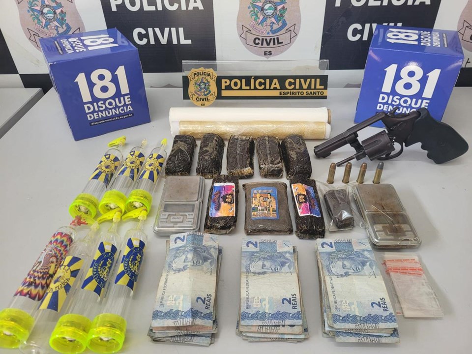 Dentro da casa, após a abordagem, foram encontradas porções de drogas, além de uma arma de fogo e dinheiro. Em poder do suspeito, foram apreendidos 800 gramas de haxixe, avaliados em cerca de R$ 40 mil, um revólver calibre .38 com quatro munições, sete tubos de lança perfume vazios, duas balanças de precisão, R$131 em espécie, material para embalo de drogas e aparelhos de telefone celular.