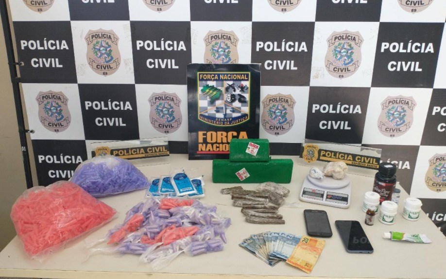 Na ocasião, foram encontrados em poder dos investigados 144 gramas em porções de maconha; duas barras de maconha de 334 e 647 gramas; 126 gramas de crack; 420 pinos de cocaína; dois celulares; três frascos de ácido bórico; um frasco e uma bisnaga de cloridrato de lidocaína; um frasco de cafeína pura; uma balança de precisão; diversos pinos vazios; material para embalo de drogas e R$ 44,00 em espécie.