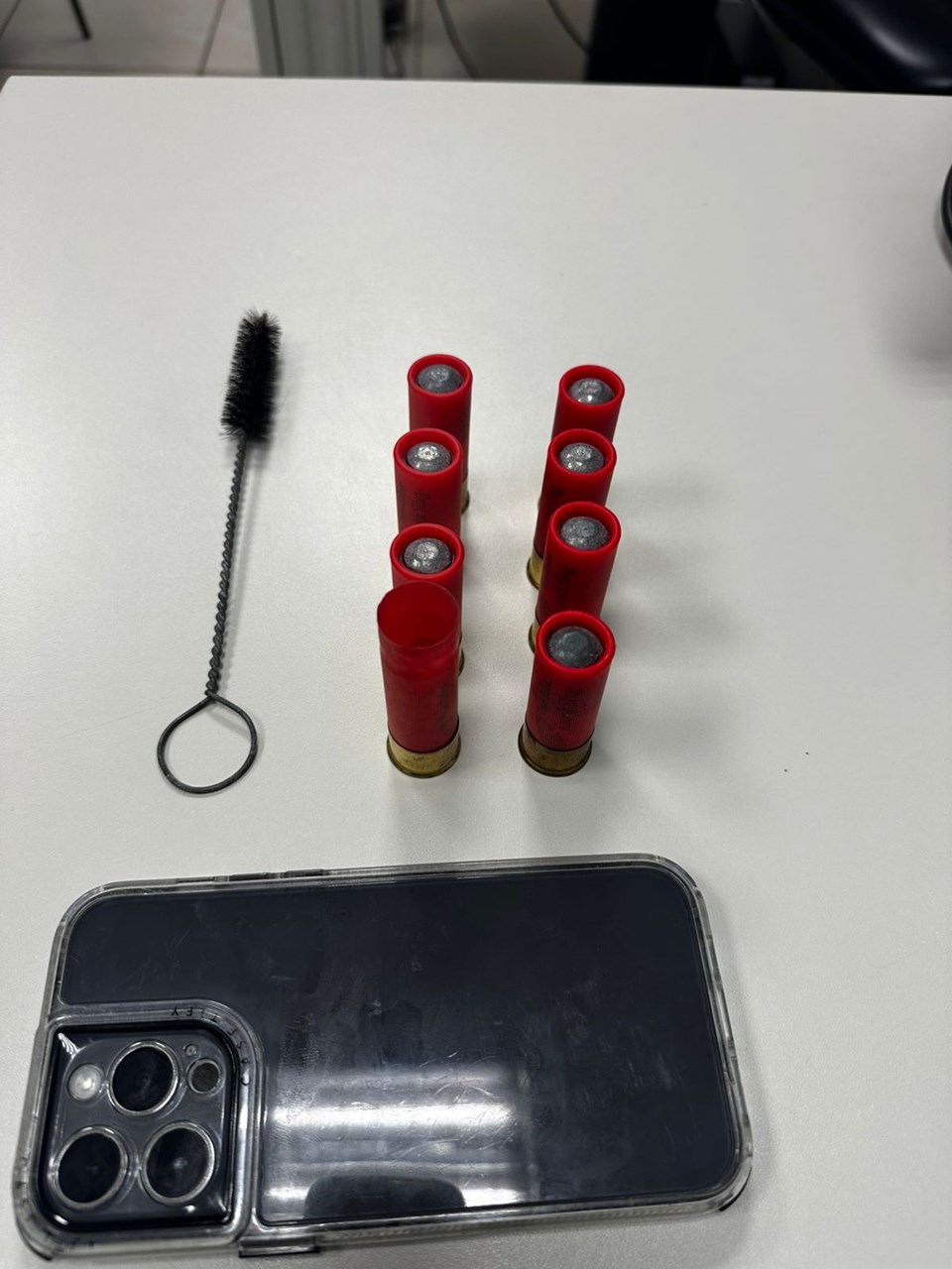 A prisão ocorreu durante o cumprimento de mandado de busca e apreensão. Na residência do suspeito, foram localizadas sete munições calibre 12, além de um cartucho deflagrado do mesmo calibre e uma escova de limpeza para arma.
