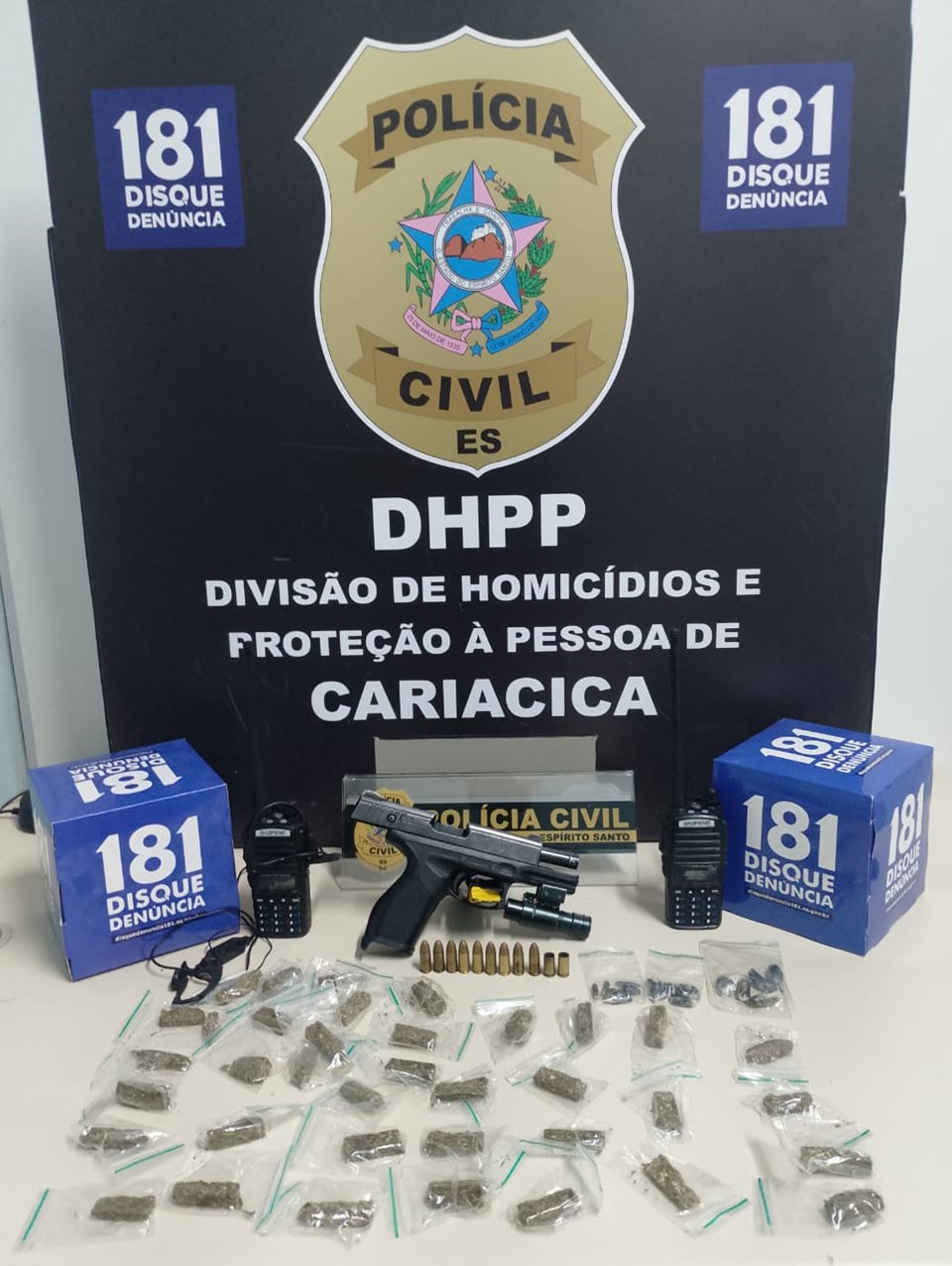 Com o suspeito foram apreendidos uma pistola Taurus calibre 9mm com sinal de identificação suprimido, um carregador de pistola calibre 9mm com capacidade para 17 munições, nove munições calibre 9mm, um dispositivo de mira laser, 36 buchas de maconha, 24 buchas de haxixe e dois rádios comunicadores.