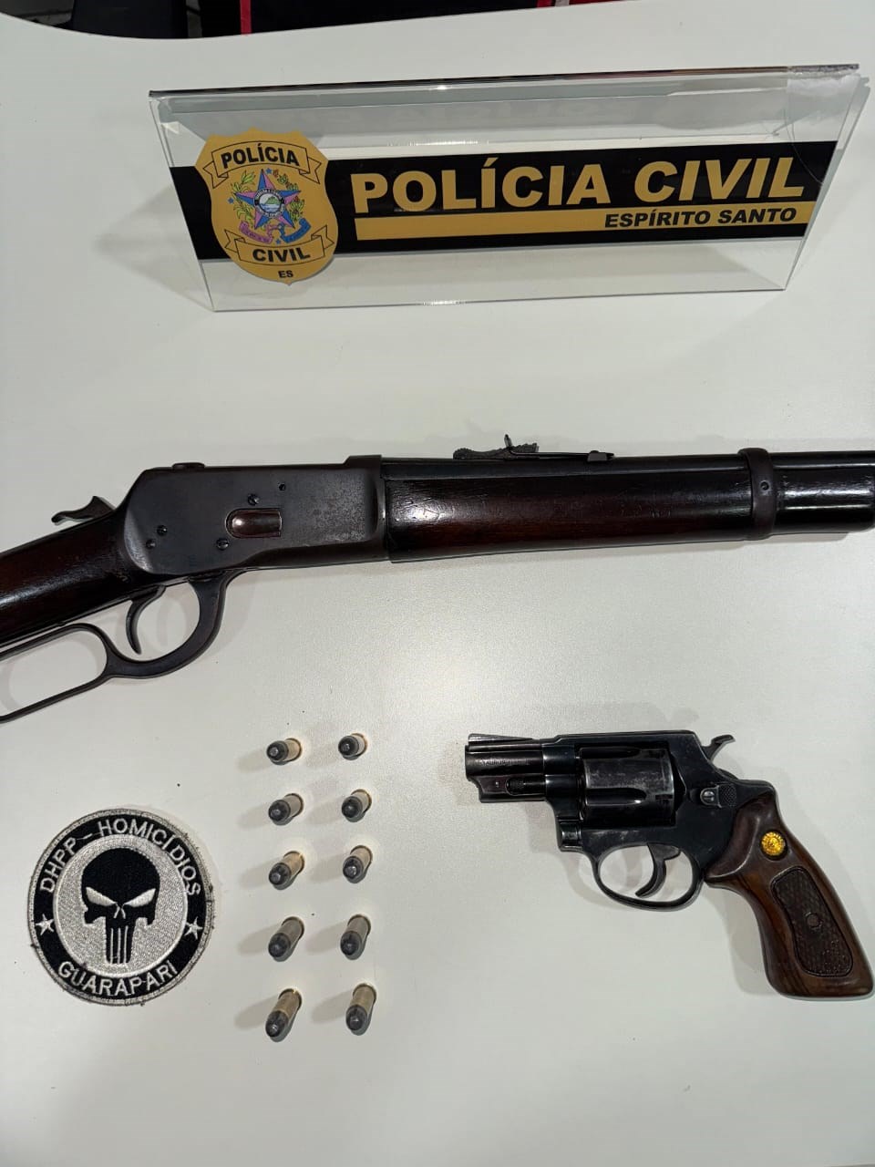 Durante abordagem, os policiais localizaram um revólver calibre .38 com numeração suprimida no bolso do suspeito, além de munições do mesmo calibre. Na propriedade, também foi encontrada uma carabina calibre .38. O homem foi autuado em flagrante por posse ilegal de arma de fogo de uso restrito, conforme o artigo 16, §1º, inciso I, da Lei nº 10.826/2003, além do cumprimento do mandado de prisão. Ele foi encaminhado para o Centro de Triagem, localizado no Complexo Penitenciário Rodrigo Figueiredo da Rosa.
