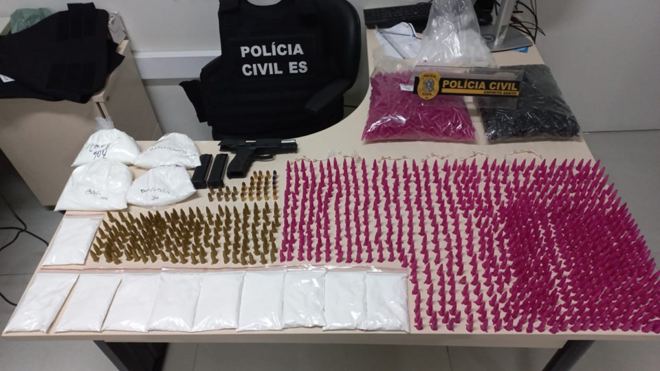 No local, foram apreendidos 868 pinos de cocaína e material para embalo de entorpecentes. Em outro ponto, em cumprimento a um mandado de busca e apreensão, foram apreendidos uma pistola, dois carregadores e munições.