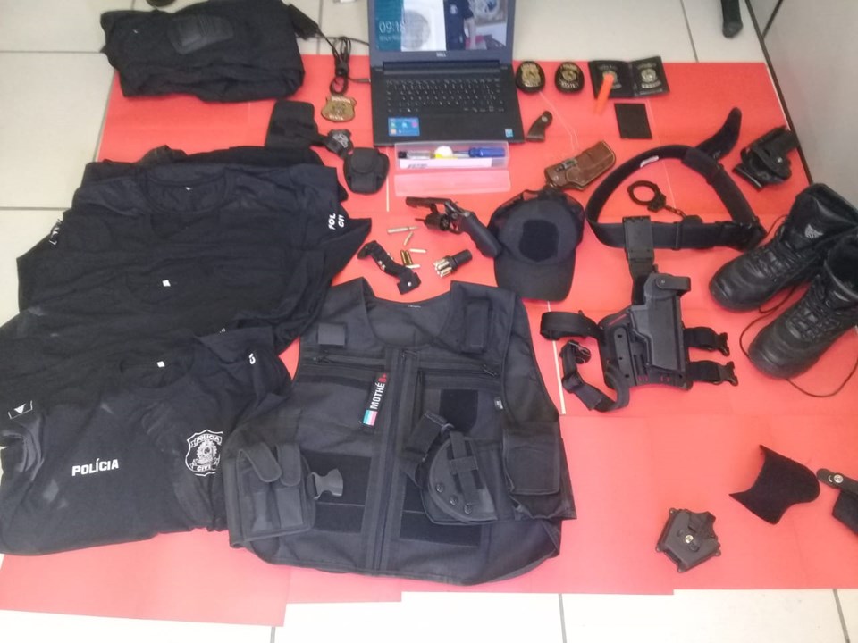 Nas buscas, encontraram um revólver calibre 38, 14 munições, seis camisas imitando as da Polícia Civil, coldres, calças táticas e outros itens semelhantes ao uniforme. E.C.M. acabou preso em flagrante e encaminhado para a 7ª Delegacia Regional do município.