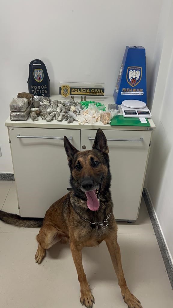 Foram realizadas buscas, sendo localizadas no quarto do casal 87 pedras de crack, 106 buchas de maconha, 110 pinos de cocaína, duas balanças de precisão, um caderno com anotações do tráfico de entorpecentes e sete munições. No quintal do imóvel, a polícia ainda encontrou uma motocicleta com restrição de furto e roubo. Durante as buscas foi empregado o cão farejador Rex.