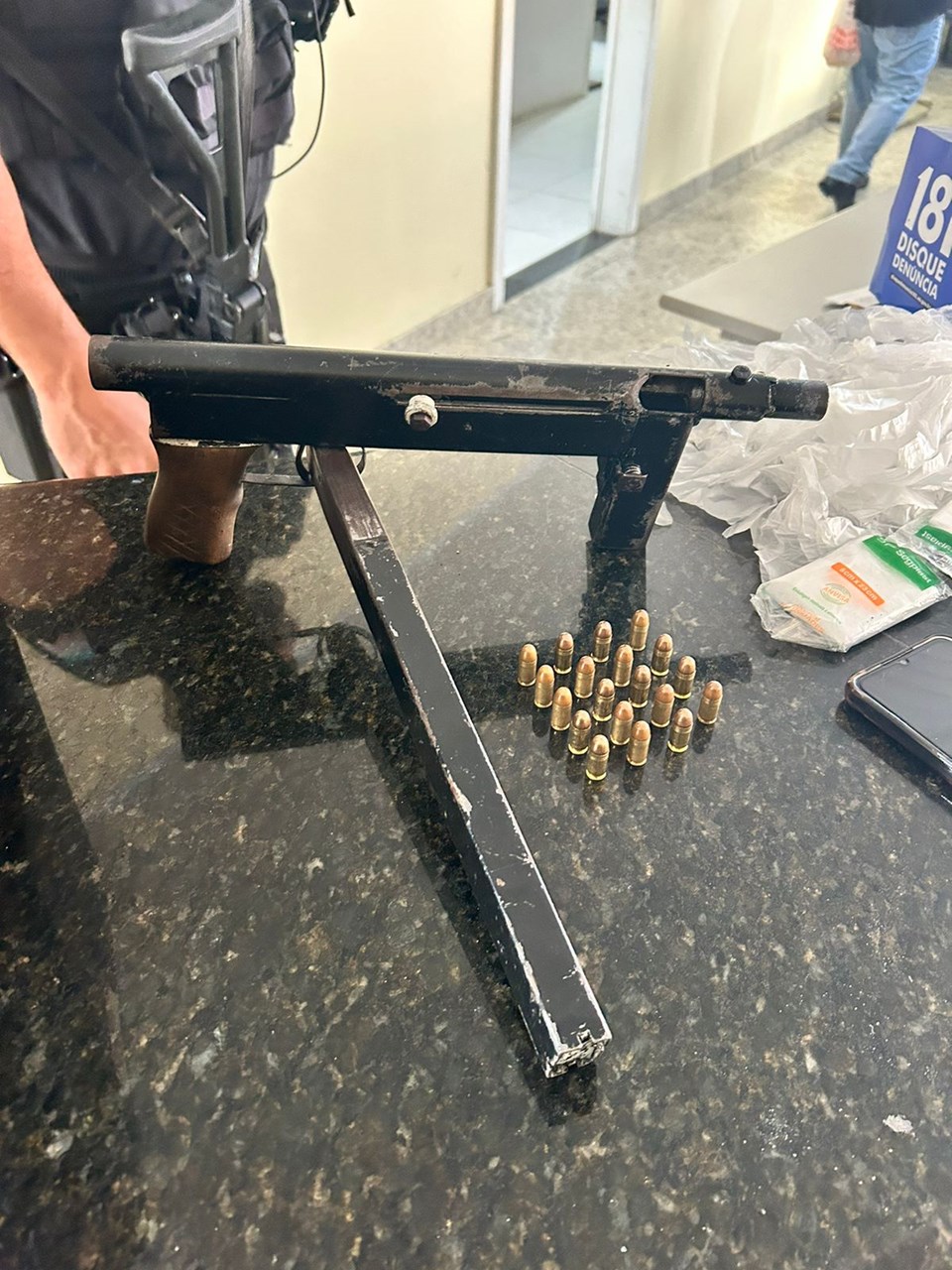 No local, foi realizado um cerco tático, sendo possível localizar e prender o investigado. Foram apreendidas uma submetralhadora de fabricação artesanal e 19 munições de calibre .38. O detido foi autuado em flagrante por posse ilegal de arma de fogo.