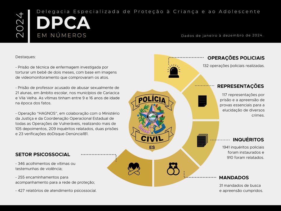 A Polícia Civil do Espírito Santo (PCES), por meio da Delegacia Especializada de Proteção à Criança e ao Adolescente (DPCA), divulgou, nesta segunda-feira (13), o balanço das ações desenvolvidas durante o ano de 2024. Ao todo, foram relatados 910 Inquéritos Policiais, instaurados 1.941 e concluídos com 31 prisões realizadas, além de 31 mandados de busca e apreensão cumpridos.