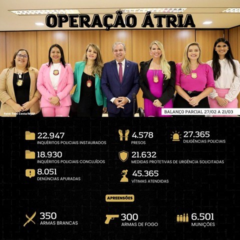O Ministério da Justiça e Segurança Pública (MJSP) divulgou, nessa terça-feira (21), o balanço parcial da Operação Átria, deflagrada em 27 de fevereiro. Coordenada pela Secretaria Nacional de Segurança Pública (Senasp) e articulada com as secretarias estaduais de segurança com liderança situacional das Polícias Civis de todo Brasil, a Operação visa combater a violência contra a mulher