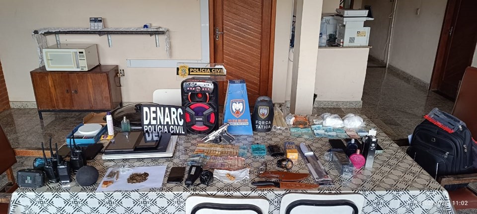 Nas buscas, com apoio do cão farejador Atena, foram apreendidas drogas, uma pistola calibre .380, munições, dinheiro, além de equipamentos eletrônicos, como notebook, tablet, caixa de som, rádio comunicador e assistente virtual. Também foram recolhidos relógios, ferramentas, perfumes e outros objetos com indícios de serem produtos de furtos e roubos na região.