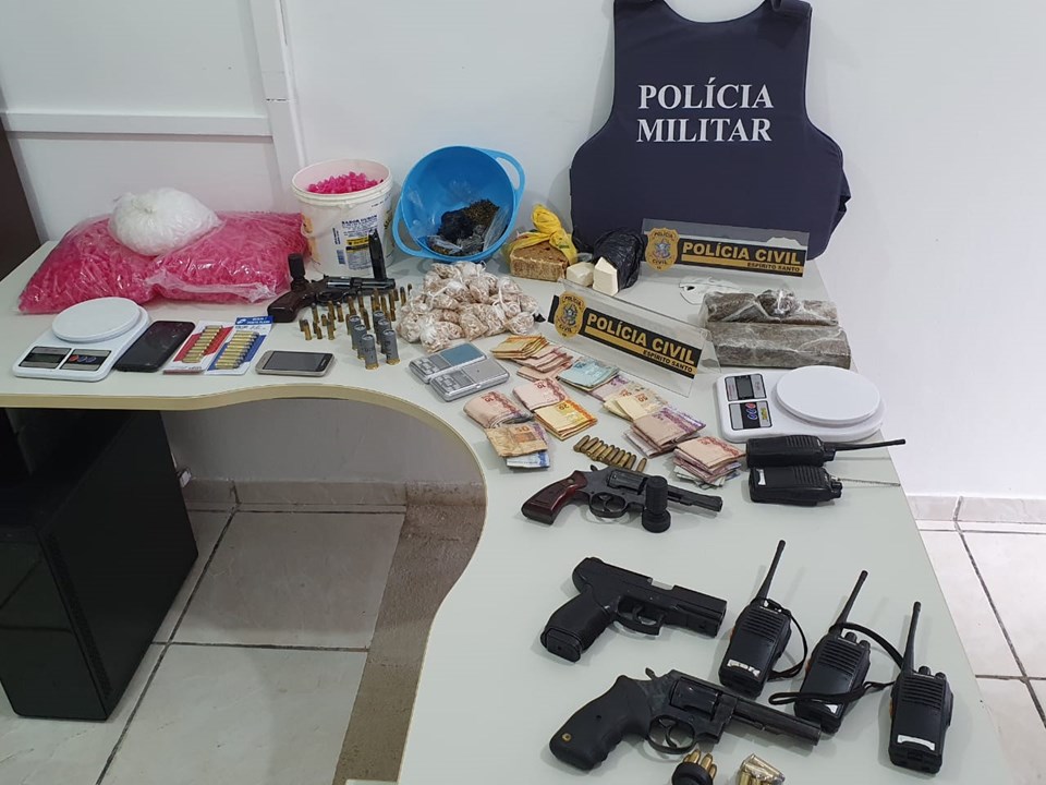 Durante o cumprimento dos mandados de busca e apreensão domiciliar foram apreendidos um quilo de maconha, 15 buchas da mesma substância, 390 gramas de cocaína, 505 gramas e 1.760 pedras de crack, três armas de fogo do tipo revólver, um simulacro do tipo pistola, 63 munições de calibre 38, cinco munições de calibre 12, 17 munições de calibre 32, uma munição de calibre 380, dois calibre 22, três jet loaders, um carregador de pistola calibre 7.65, balanças de precisão, kit manutenção limpeza para arma de fogo, rádios comunicadores, aparelhos de celular, cerca de 2.000 pinos de plásticos vazios, material comumente utilizado no envase de entorpecentes, bem como a quantia de R$ 3.493,00 em espécie, além de uma motocicleta.