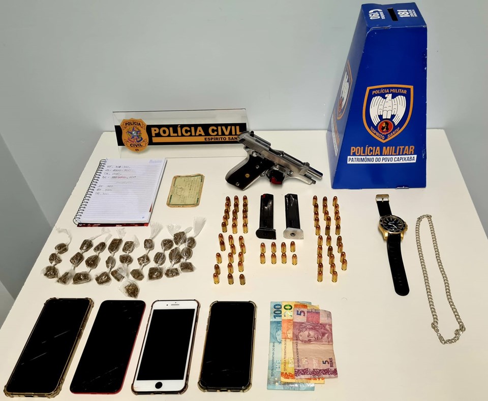 No imóvel, os policiais também encontraram um adolescente de 16 anos, que foi apreendido. A equipe também recolheu uma pistola, munições, drogas, dinheiro e anotações do tráfico. O detido maior de idade foi autuado em flagrante pelos crimes de tráfico de drogas, associação para o tráfico e posse ilegal de arma de fogo, sendo encaminhado ao sistema prisional. O adolescente assinou Boletim de Ocorrência Circunstanciado (BOC) por ato infracional análogo aos crimes de tráfico de drogas e associação para o tráfico e foi reintegrado à família.
