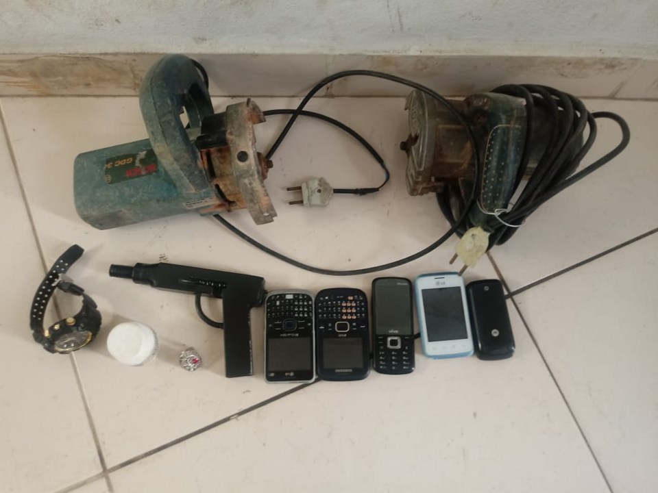 Ainda no bairro Aeroporto, os policiais prenderam os suspeitos G.P.F. e G.F.S., que estavam na residência de A.C.L. “No local, foram encontrados diversos materiais de procedência duvidosa, como celular e ferramentas, entre outros, que não foi apresentada explicação, além de uma arma de fogo de fabricação caseira, calibre 22”, relatou o delegado.