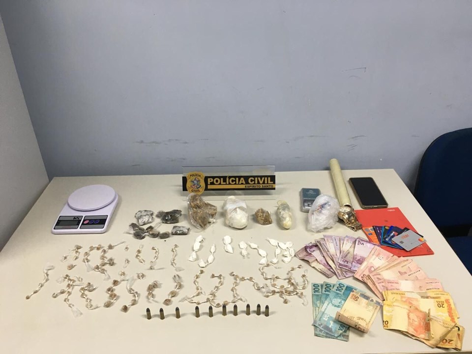 Na residência da mulher, os policiais encontraram um homem de 30 anos, que se apresentou como companheiro dela. No local, foram apreendidos R$ 1.136,00 em espécie; um pedaço de crack com 50 gramas; outro com 10 gramas; 22 buchas de cocaína totalizando 35 gramas; 10 buchas de maconha com 30 gramas; quatro pedaços de maconha com 55 gramas; cinco buchas de haxixe com 30 gramas; 97 pedras pequenas de crack com 30 gramas; 56 comprimidos com 15 gramas; 31 pedras médias de crack com 30 gramas; 10 munições calibre .32; um rolo de papel filme para endolar as drogas; duas balanças de precisão; um relógio; 10 cartões bancários; um molho de chaves; um aparelho celular; um caderno com anotações do tráfico; um bilhete destinado ao filho da mulher, que está preso no Centro de Detenção Provisória (CDP); além de diversos sacolés utilizados para embalar os entorpecentes.